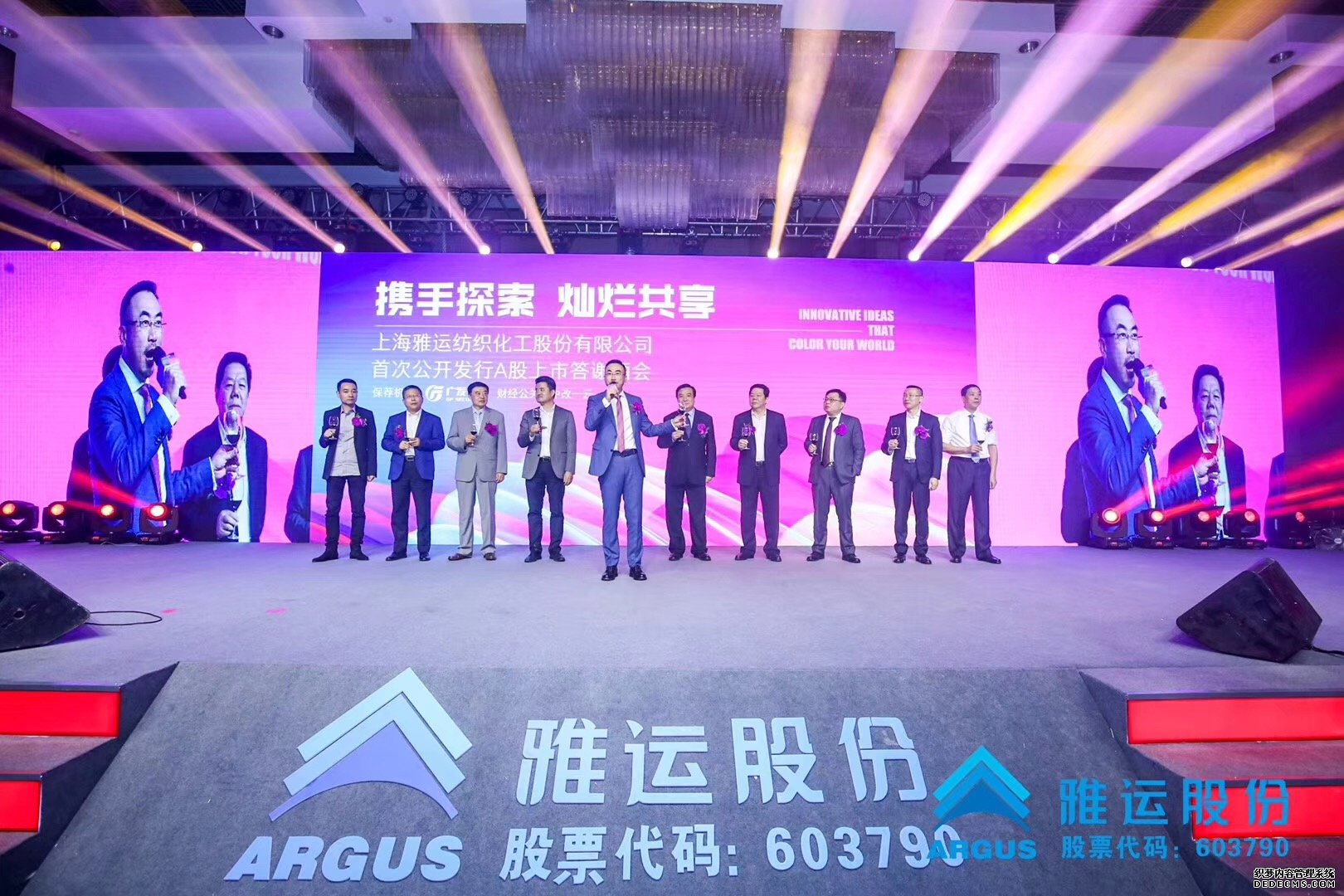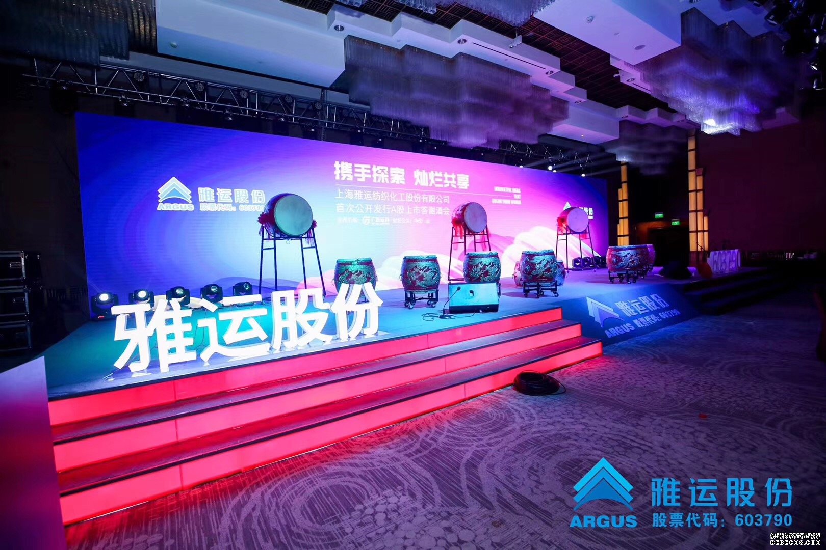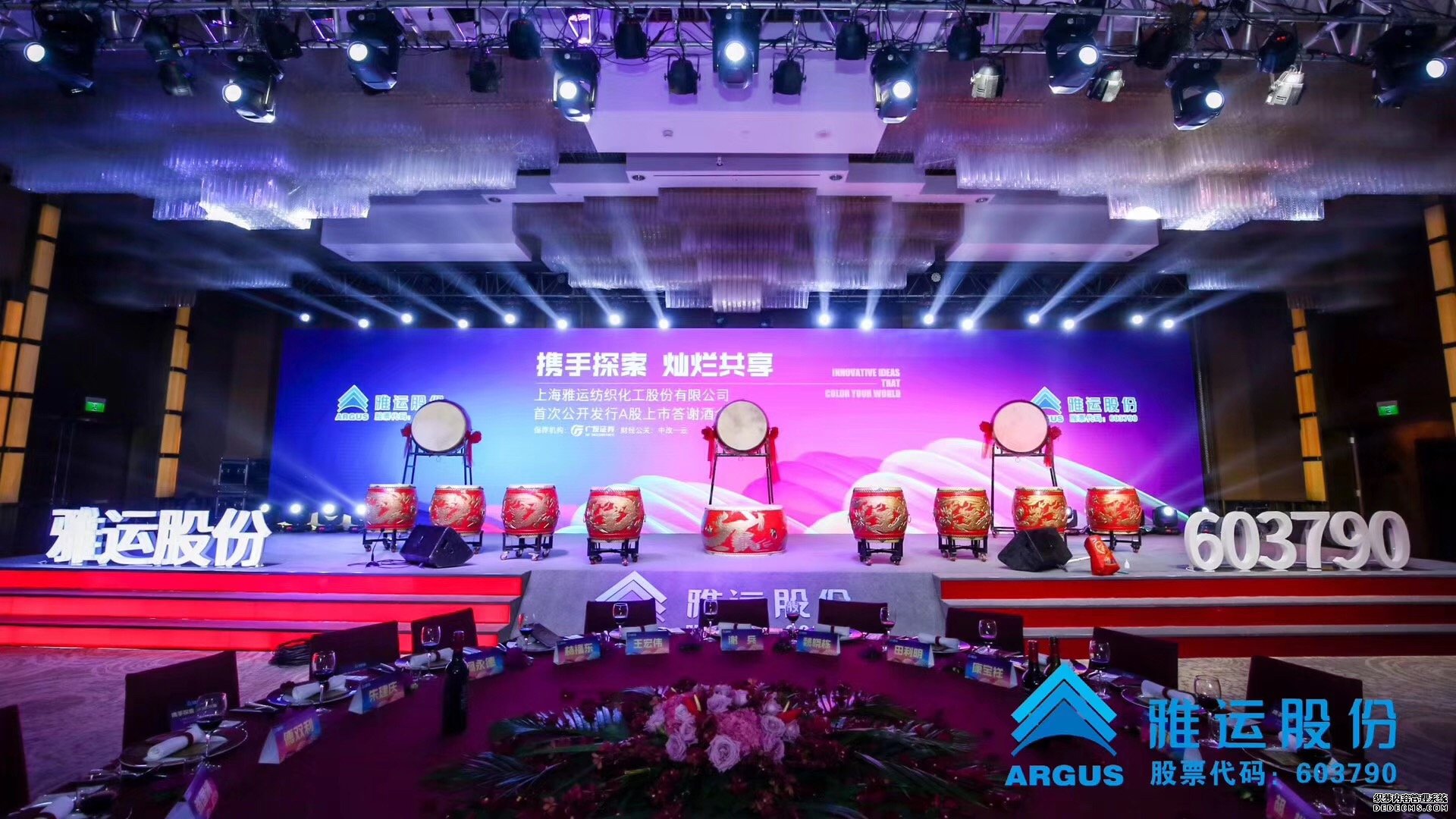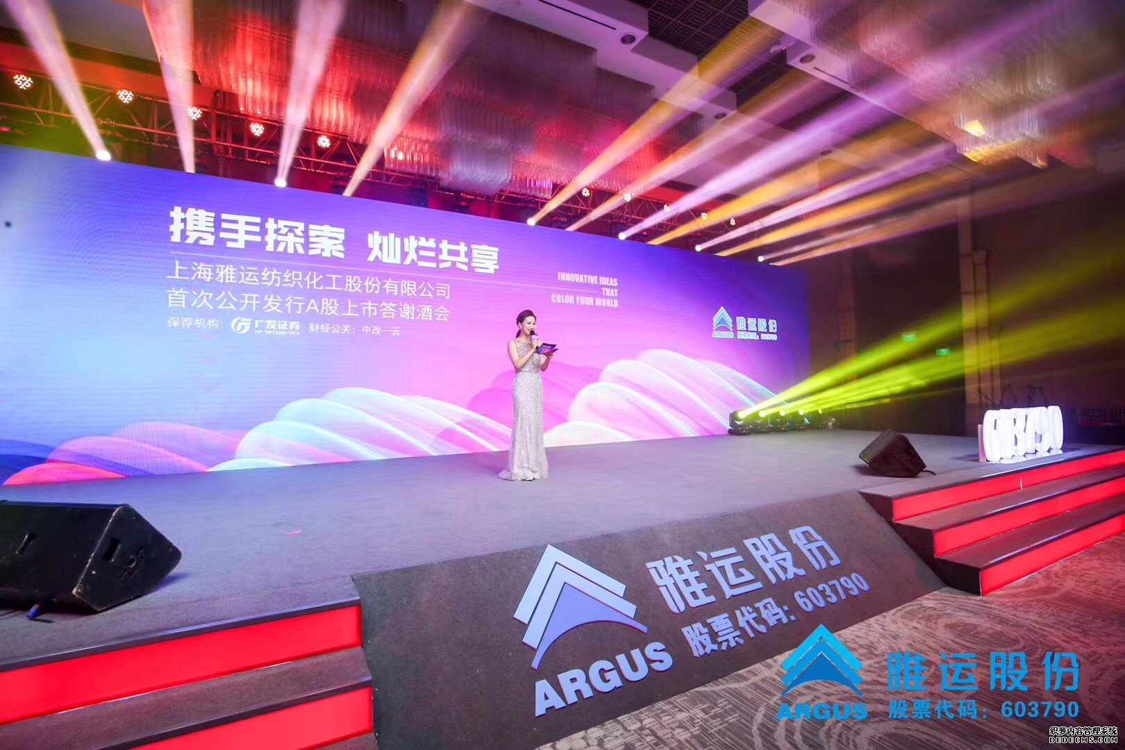 上海雅運紡織化工股份有限公司,成立于1999年8月11日,是一家專業致力于紡織化工產品的研發、生產加工、市場推廣以及提供技術服務的高新科技企業。 2018年9月11號正式上市登錄A股,‘攜手探索,燦爛共享’就是本次答謝酒會的主題,在這個歷史性的時刻,上海束影文化也祝福雅運股份紅紅火火。